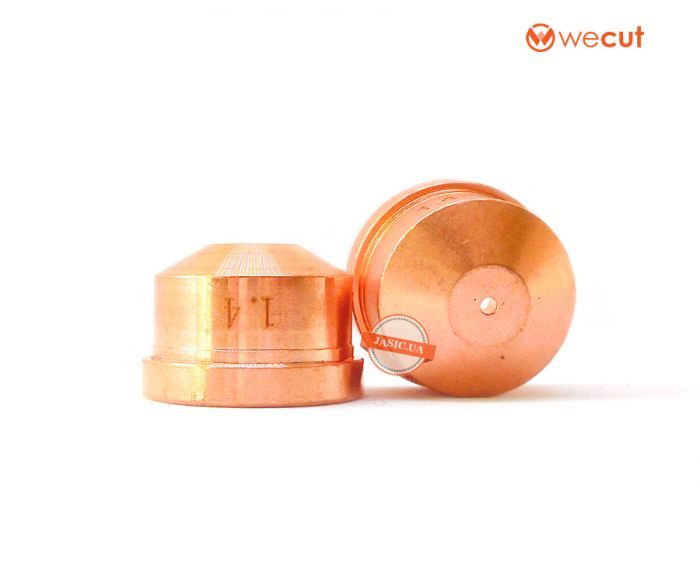 Сопло к плазмотрону - это расходный компонент, который по мере износа заменяется. Изготавливают сопла методом холодной штамповки из медного сплава или из комбинации меди и керамического наполнителя. Подбирают сопло в зависимости от тока резки, визуально за это отвечает диаметр выходного отверстия, чем больше ток резки – тем больше диаметр. Правильный диаметр и геометрия отверстия - залог качественной резки. Изношенное устье сопла или сопло с несоответствующим диаметром устья приводят к отклонениям дуги и, как результат, к снижению качества резки.