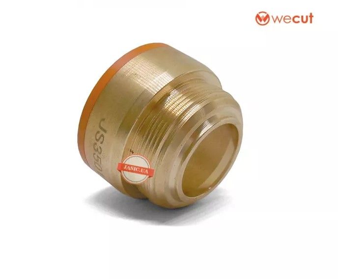 Узел "сопло - электрод" в процессе работы нуждается в защите от перегрева и разнообразных механических повреждений. Часто такая защита состоит из нескольких деталей, особенно если речь идет о промышленном оборудовании. В системе для резки JSCUT 130 применяется плазмотрон НС-1303, защита которого как раз и состоит из двух деталей. Одна из них - защитный экран, который устанавливается непосредственно на головке плазмотрона. Изготовлен защитный экран из медного сплава, это прочная толстостенная конструкция изготовленная методом холодной штамповки, в нижней части изолирующая полоса. На верхнюю часть экрана впоследствии устанавливается защитный колпачок.